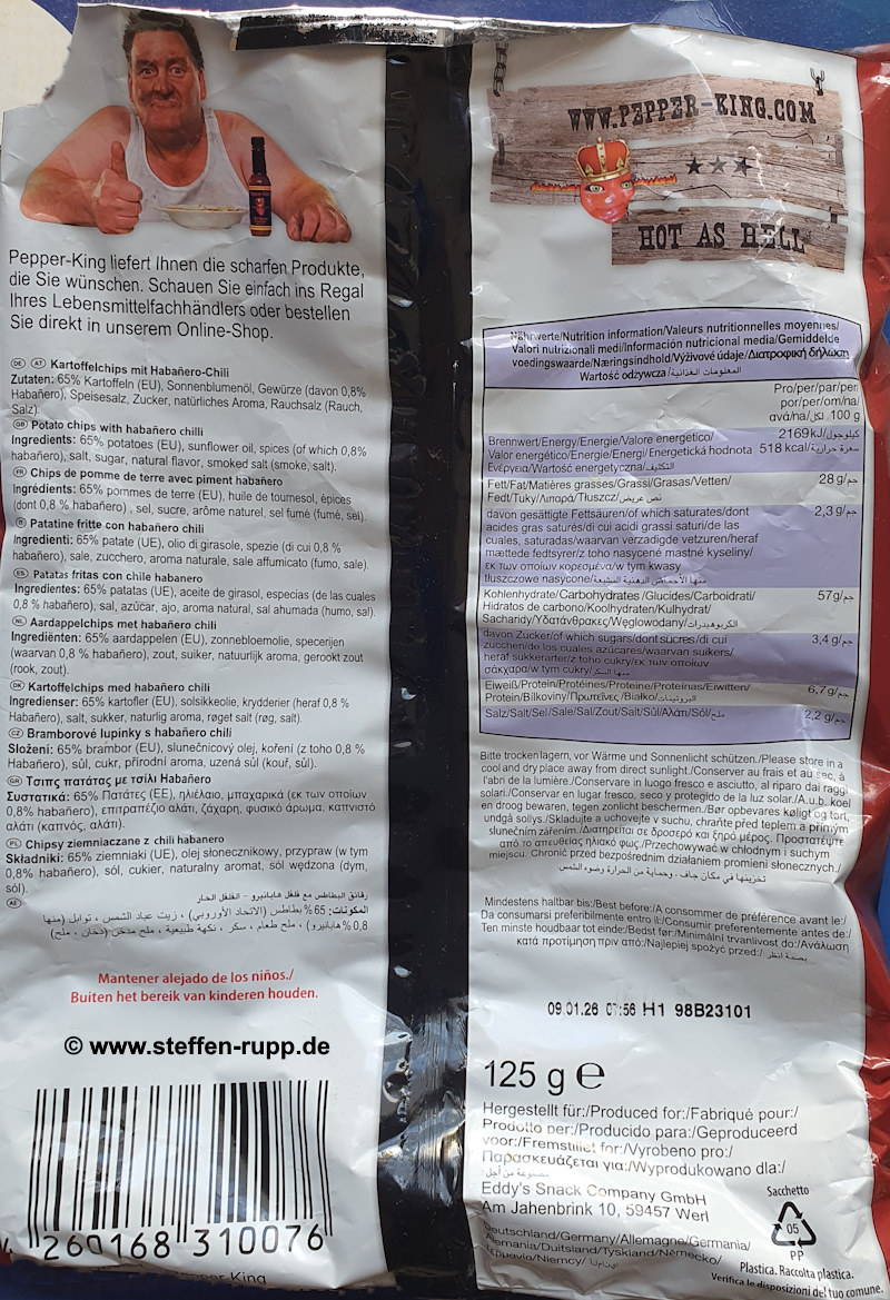 Zutaten: 65% Kartoffeln, Sonnenblumenöl, Gewürze (davon 0,8% Habanero) Speisesalz, Zucker, Knoblauch, natürliches Aroma, Rauchsalz (Rauch, Salz)