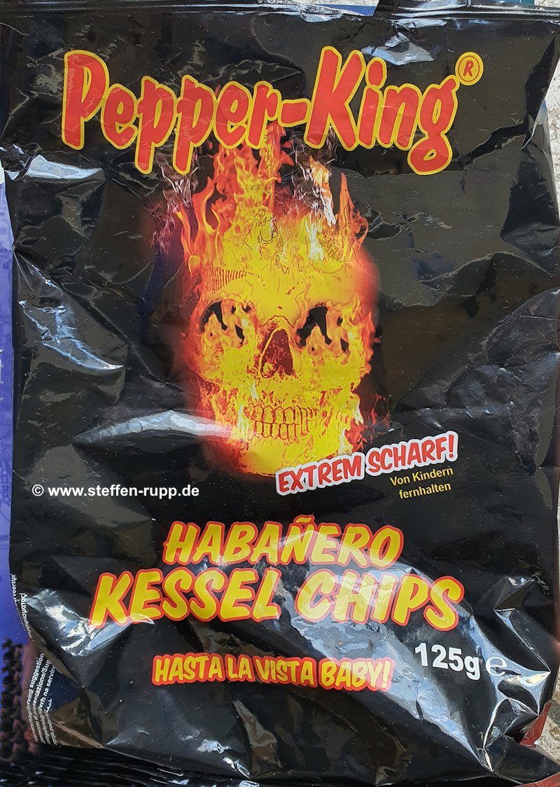 Da wollte ich bei Rewe eingentlich nur n paar normale Chips kaufen und dann seh ich die Pepper-King Habanero Kessel Chips. Da dachte ich mir, naja, kann man ja mal proieren. Bis jetzt war alles was ich mit dem Hinweis „Extrem Scharf“ gekauft hatte so im normal erträglichen Bereich. Setz mich also abends vorn Fernseher, mach die Tüte auf und fang ganz gemütlich an zu essen. Aber, holla die Waldfee… Es hat noch keine 10 Sekunden gedauert, da bin ich aufgesprungen, zum Kühlschrank gerannt und hab erst mal n halben Liter Milch hinterher geschüttet.